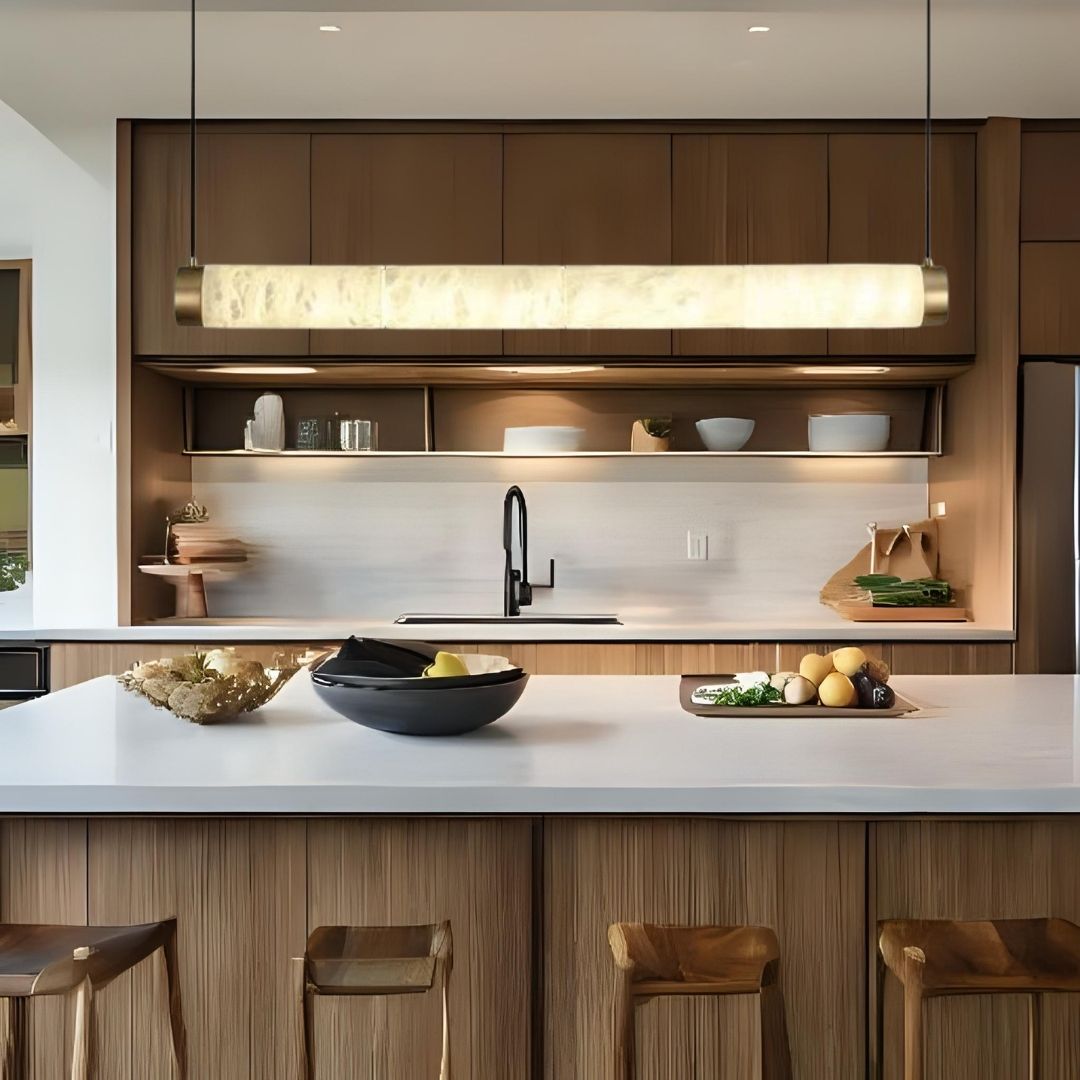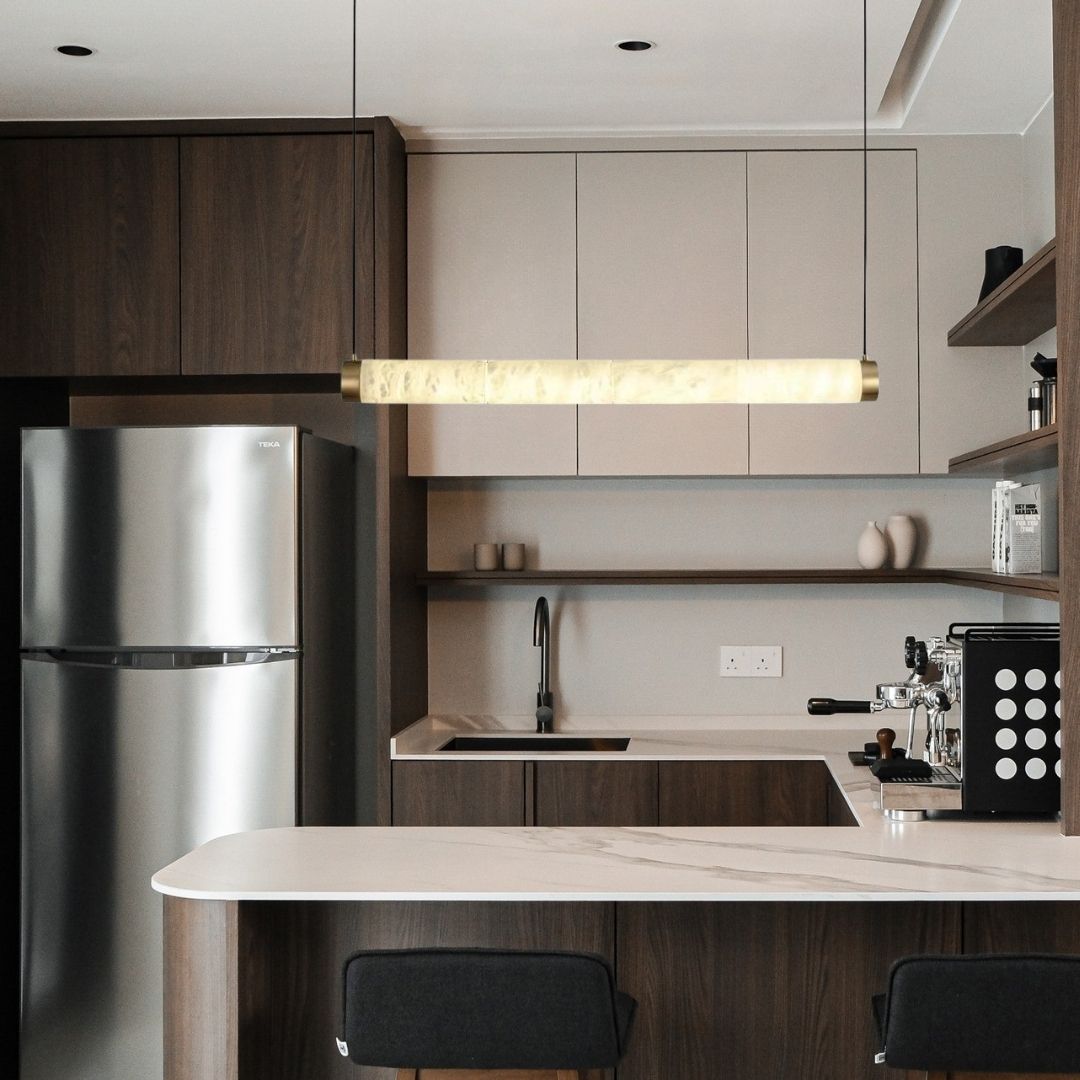 This pendant light features a blend of translucent marble and polished copper, offering a warm, diffused glow with a sleek silhouette. Its long cylindrical shape makes it ideal for modern, minimalist interiors.