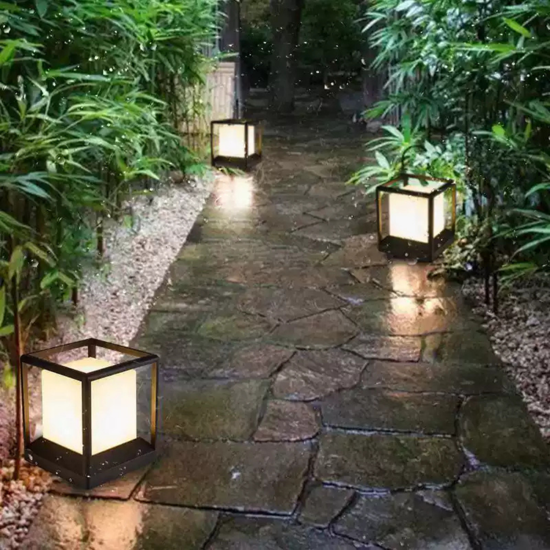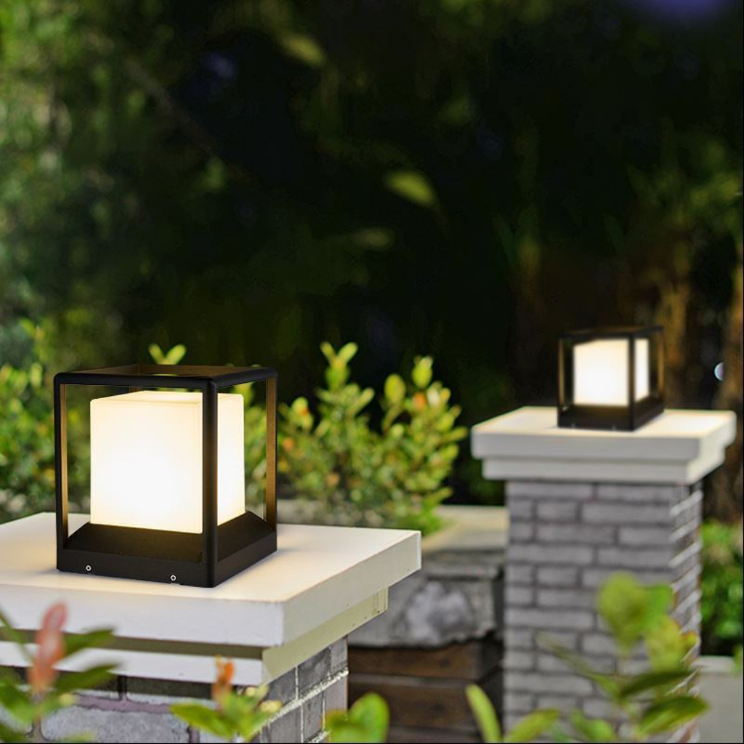 This modern outdoor gate lamp features a clean, cube-shaped design with a black metal frame and frosted white inner shade. It provides a soft, warm ambient light ideal for enhancing outdoor aesthetics and safety.
