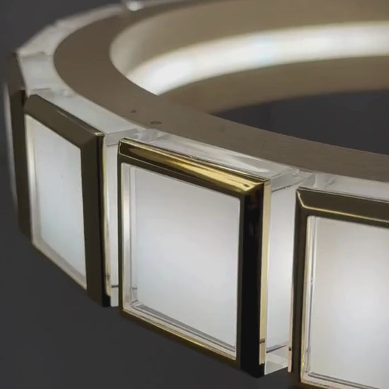 This luxurious pendant light features three circular LED rings suspended elegantly by fine cables. Each ring is framed with gold-finish borders and frosted panels that emit soft, even illumination. It's a statement piece that blends modern luxury with geometric symmetry.