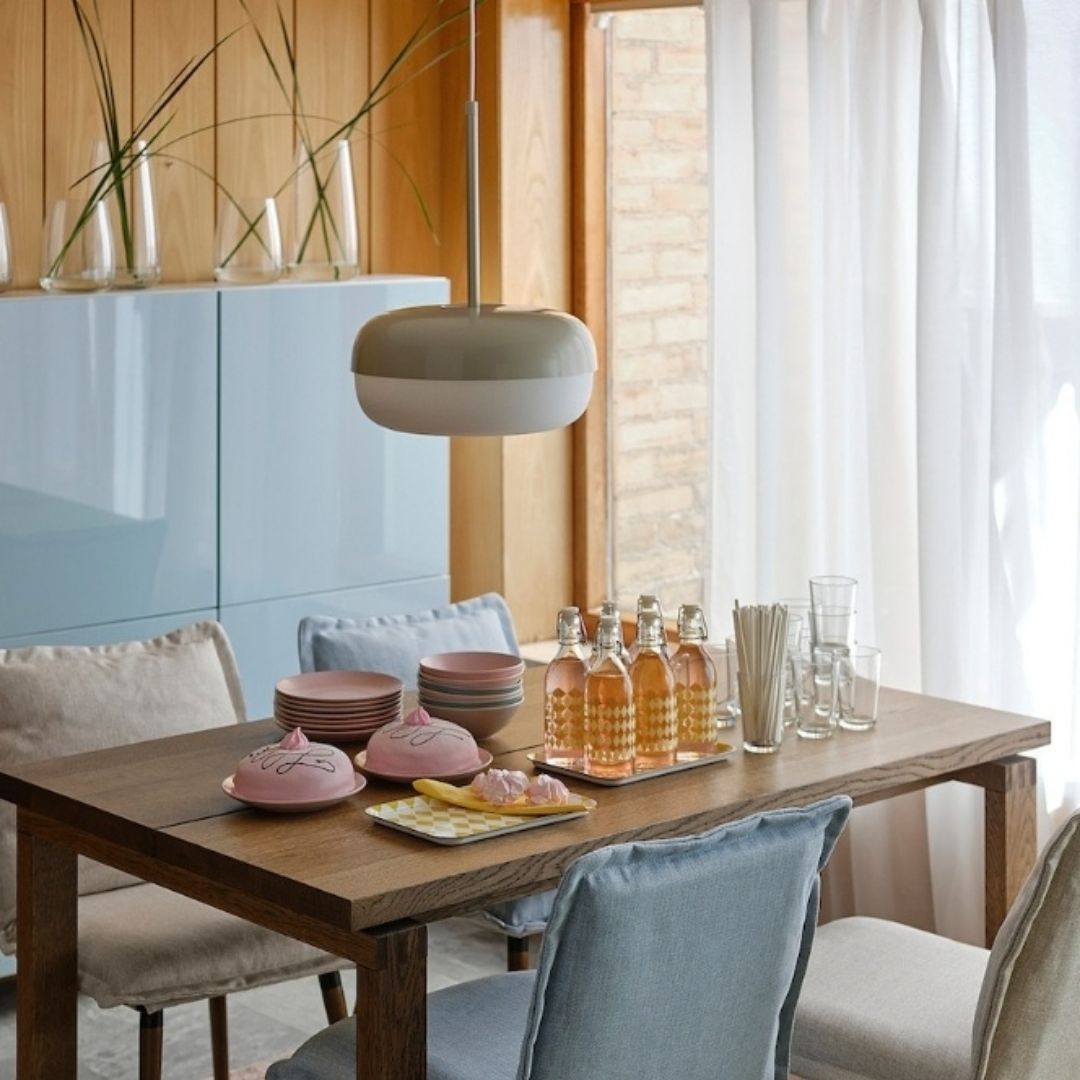 These pendant lights feature a glossy beige dome with a smooth, rounded shape and soft diffused light. Suspended elegantly above a dining table, they offer a warm and cozy glow that enhances mealtime ambiance.